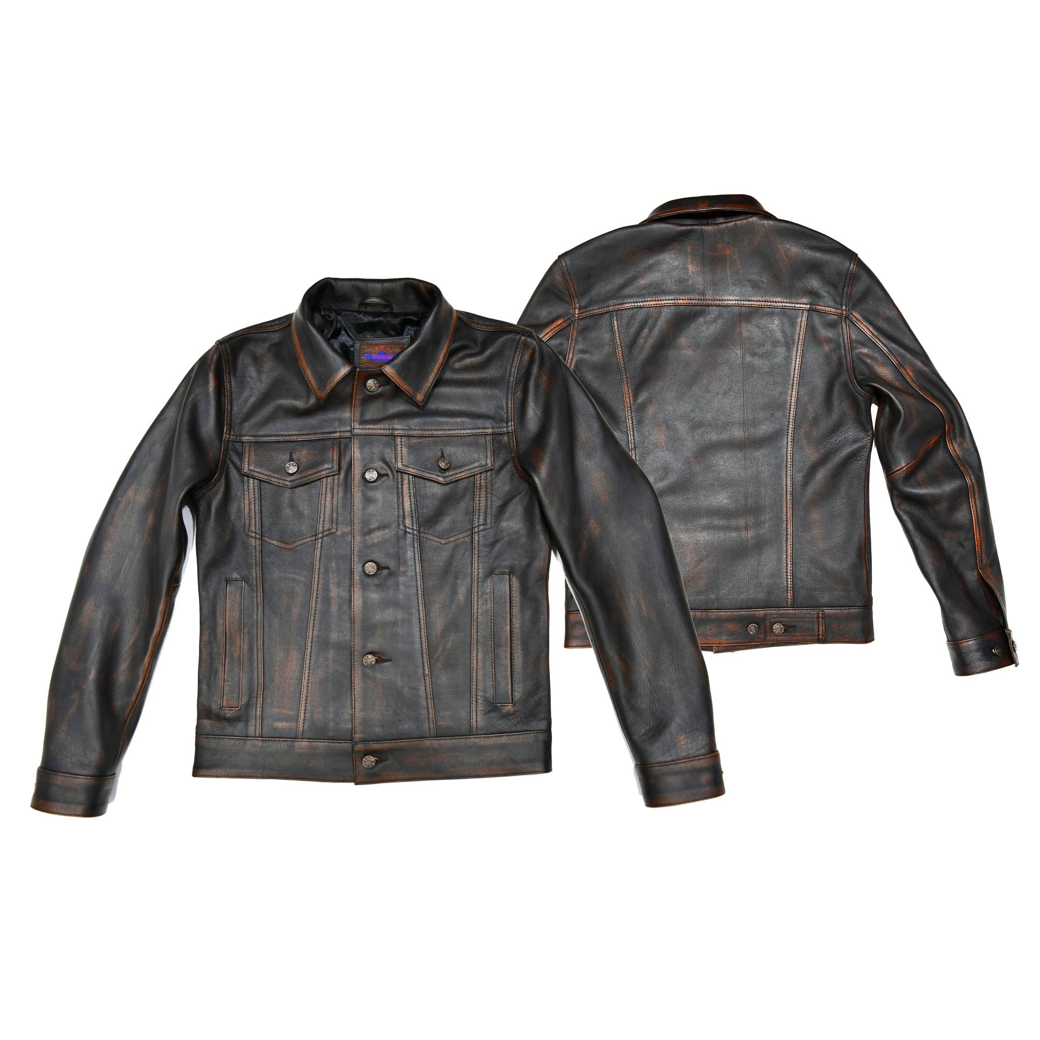Men's Trucker Classic Western Denim Style Leather Jacket crafted from premium goatskin leather. Features include two flap chest pockets, two side pockets, and a front button closure. Inside, it offers one lining pocket for added convenience. Finished in a distressed brown color with high-quality satin lining and exceptional stitching. Available in all sizes to ensure a perfect fit.