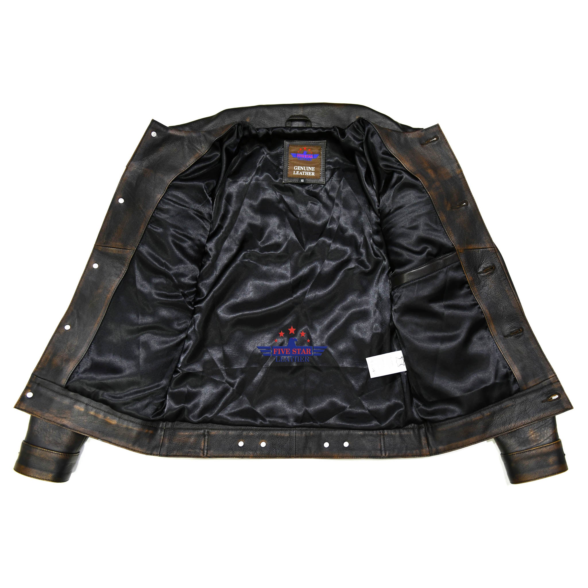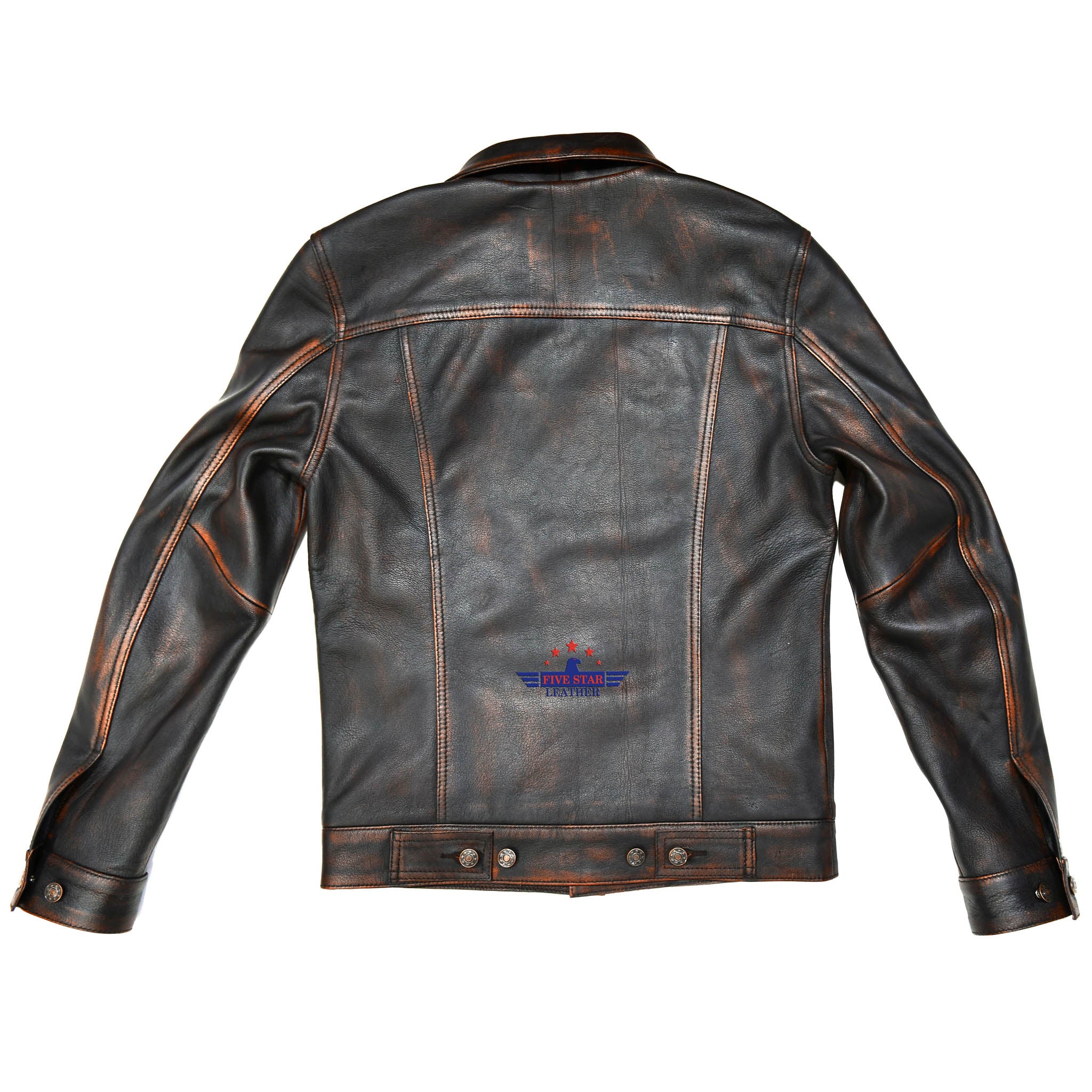 Men Trucker Real Goatskin Classic Western Denim Style Distressed Brown Leather Jacket