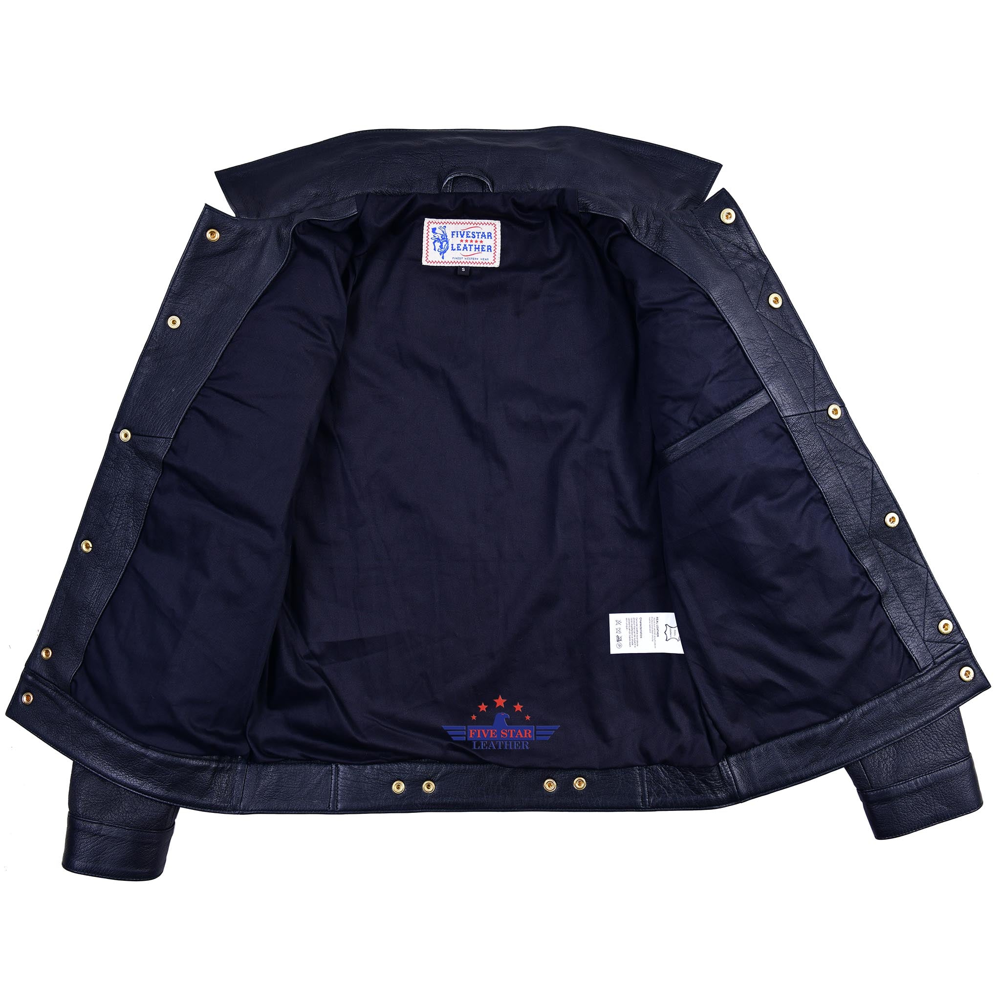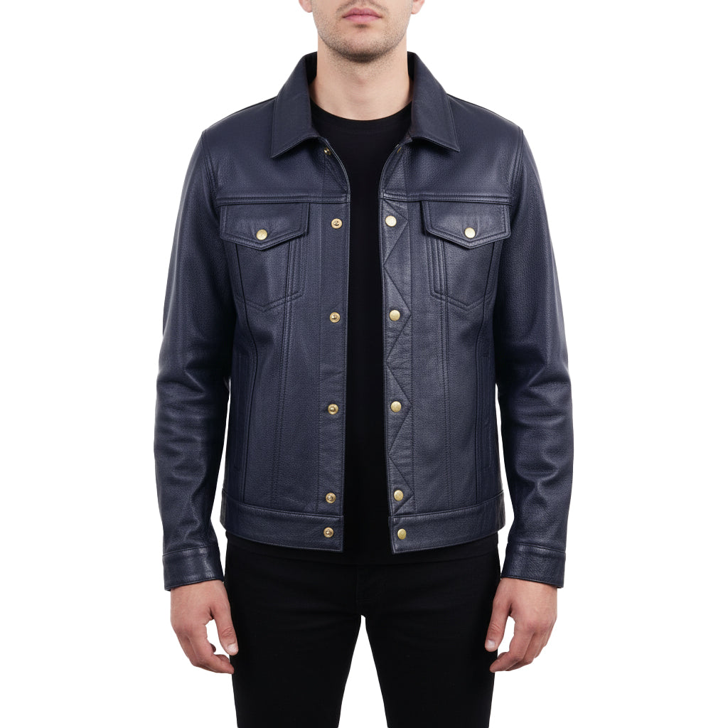 Expertly crafted using premium Goatskin leather, this men's trucker jacket features a classic Western denim style, complete with two chest pockets with flaps and two side pockets. The front closure is secured with stylish golden buttons, and there is also one inside lining pocket for added convenience. The jacket is lined with high quality cotton for maximum comfort and durability, and the fine stitching throughout adds a touch of sophistication. Available in all sizes.