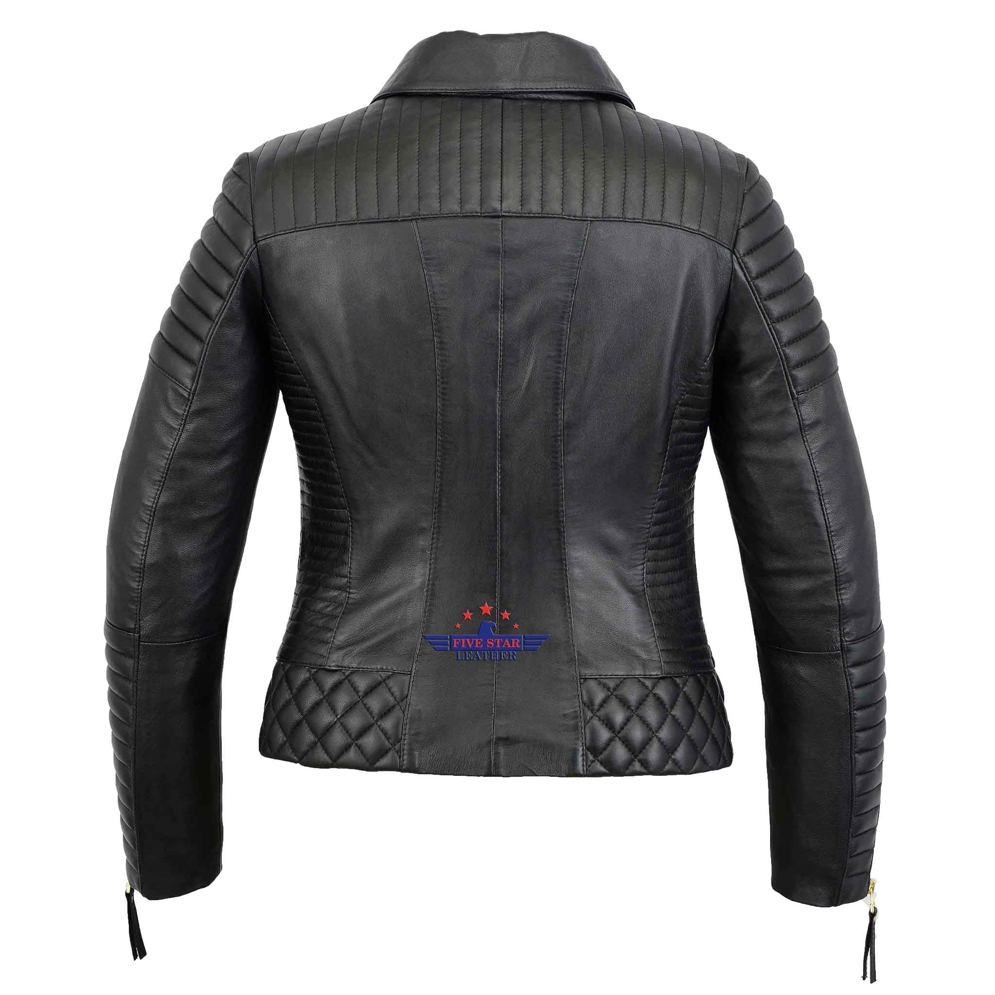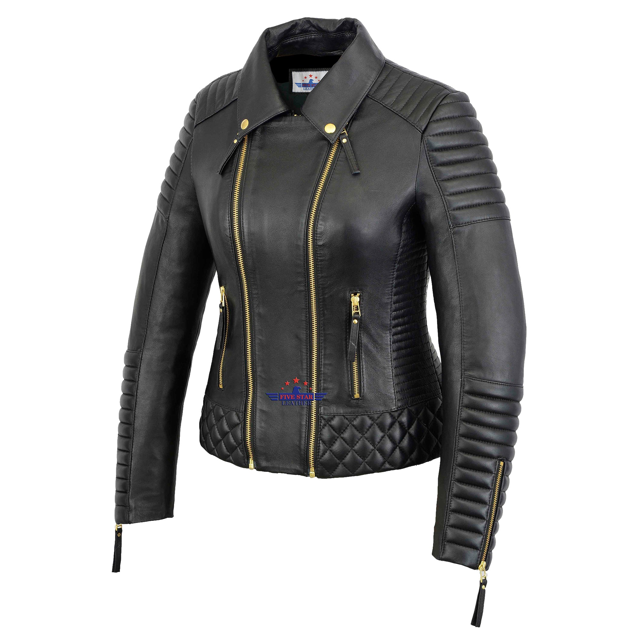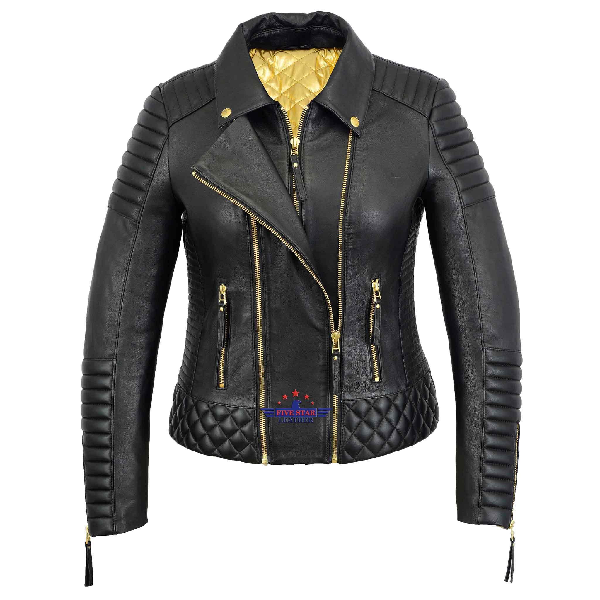 Women Real Leather Jacket Triple zip Padded Quilted Double Breasted
