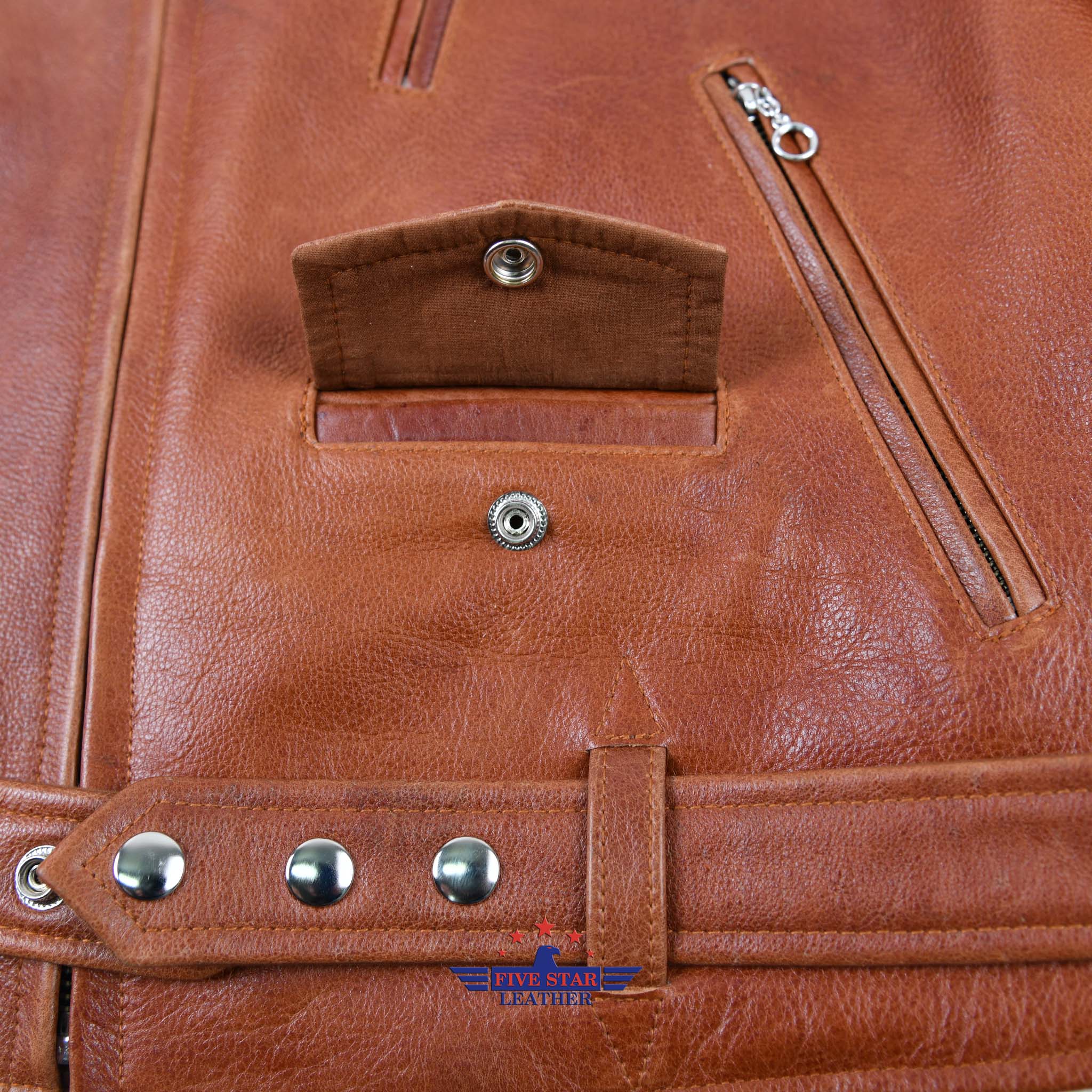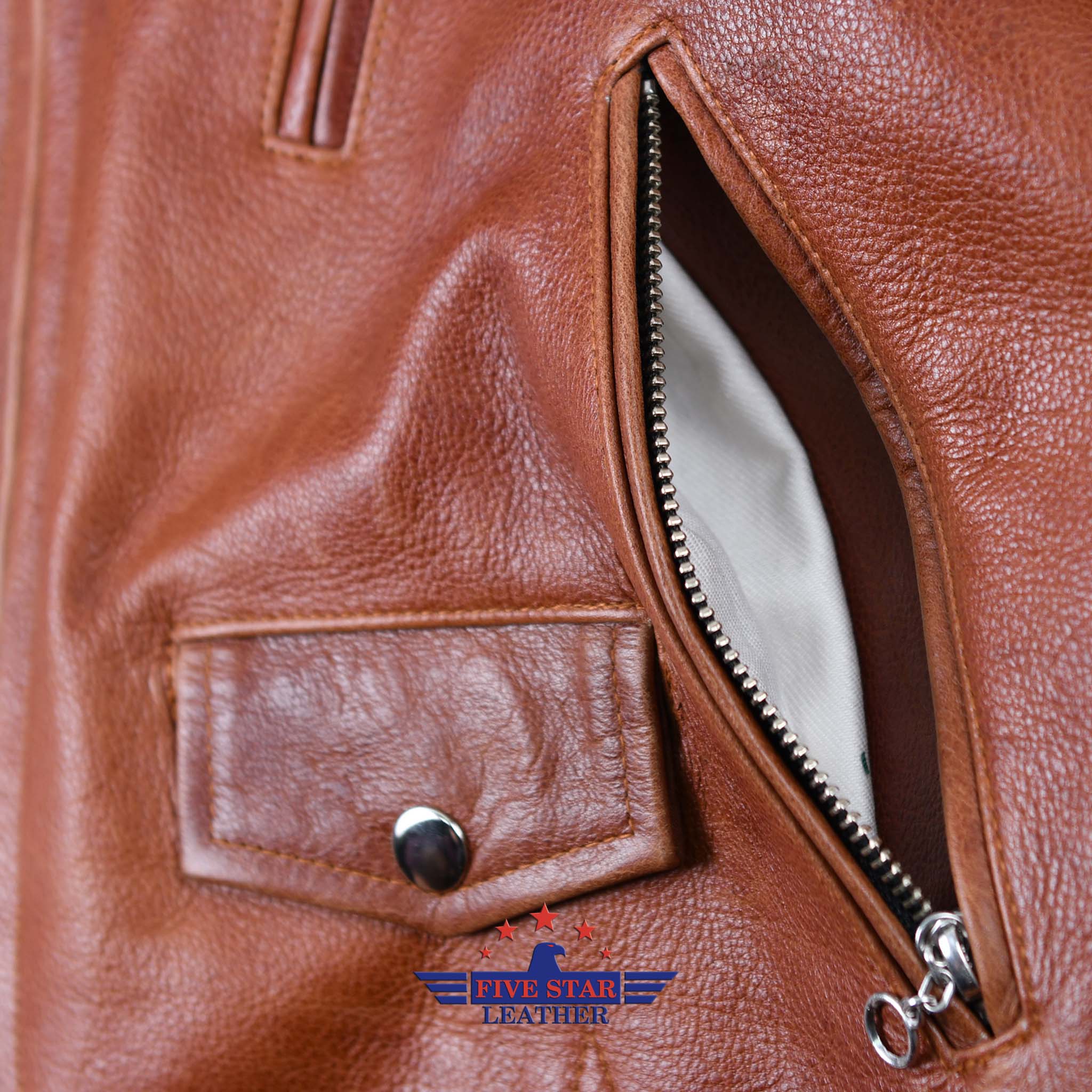 This FiveStar Leather 1950's REBEL Jacket is crafted from genuine, high-quality Horsehide leather in a sleek Visky Brown color. The Semi Veg Tanned Leather is 1.2mm thick and features a 100% wool warm lining for added warmth and comfort. The Heavy Duty YKK Zippers ensure durability and easy use. Custom sizes are also available upon request.