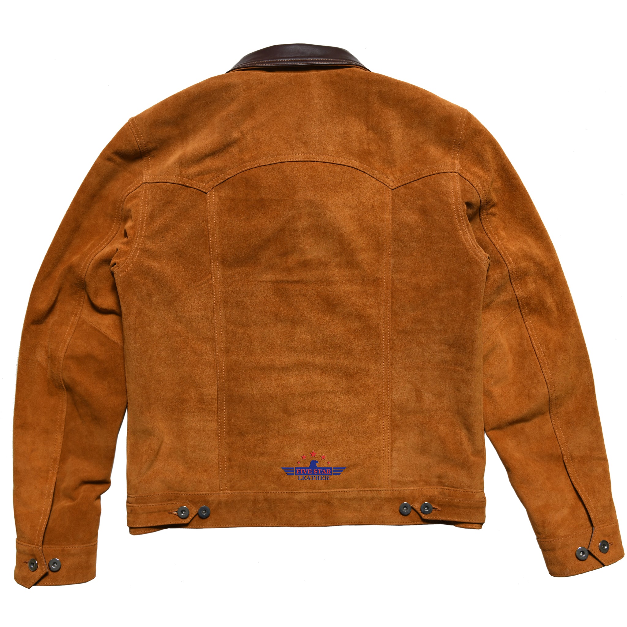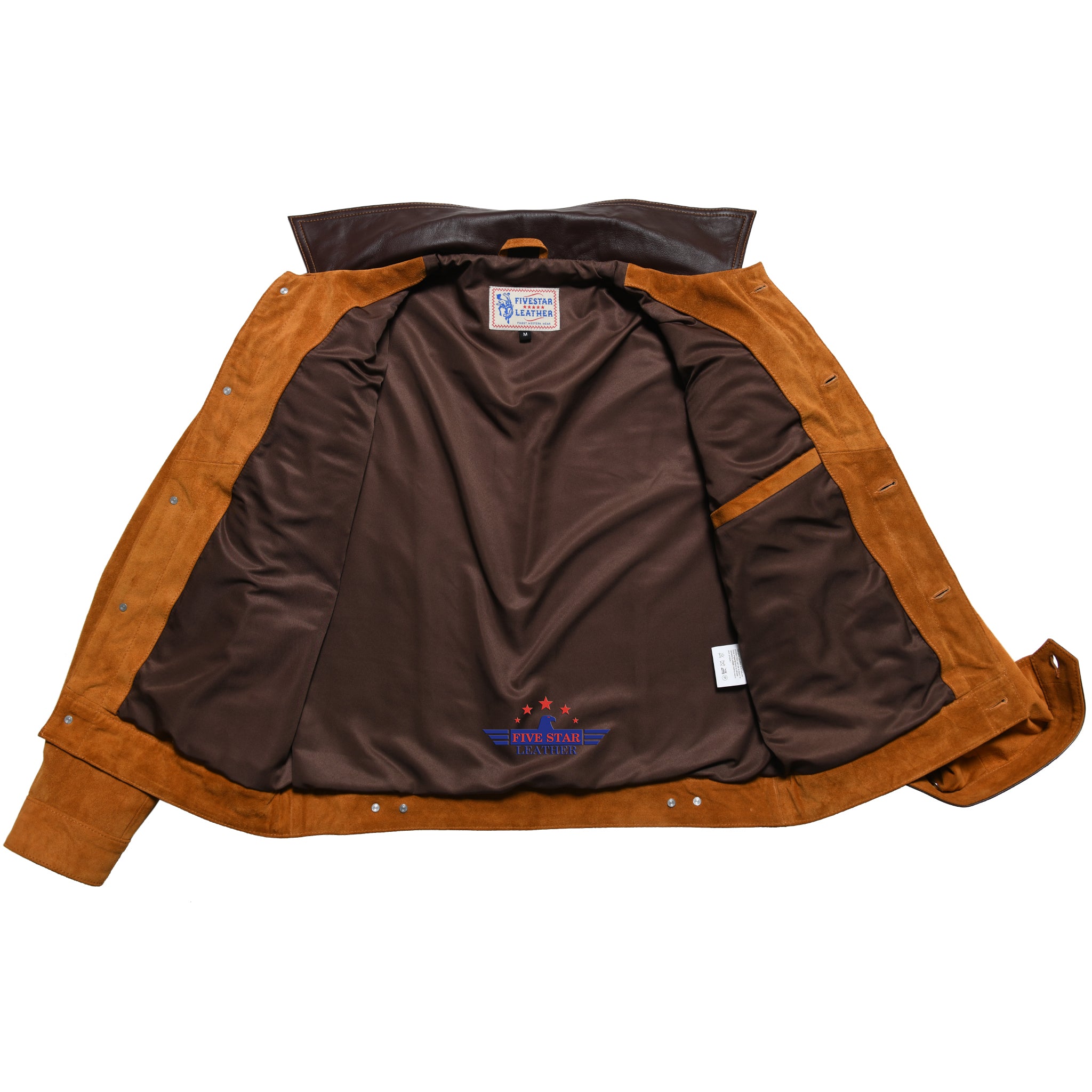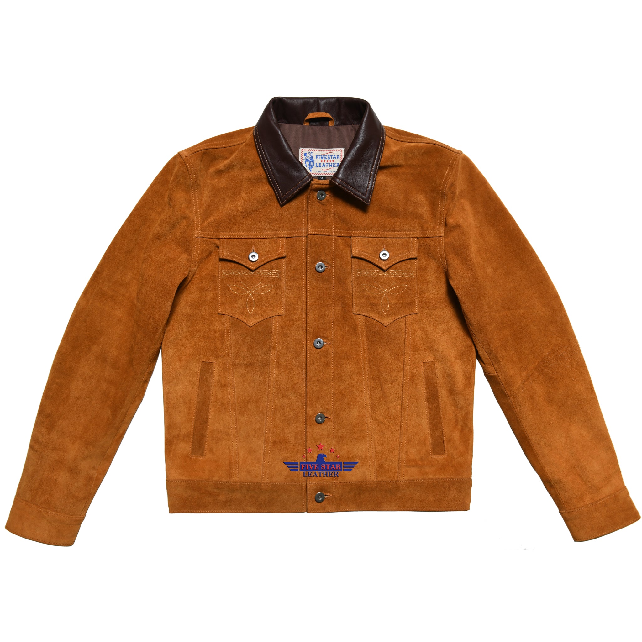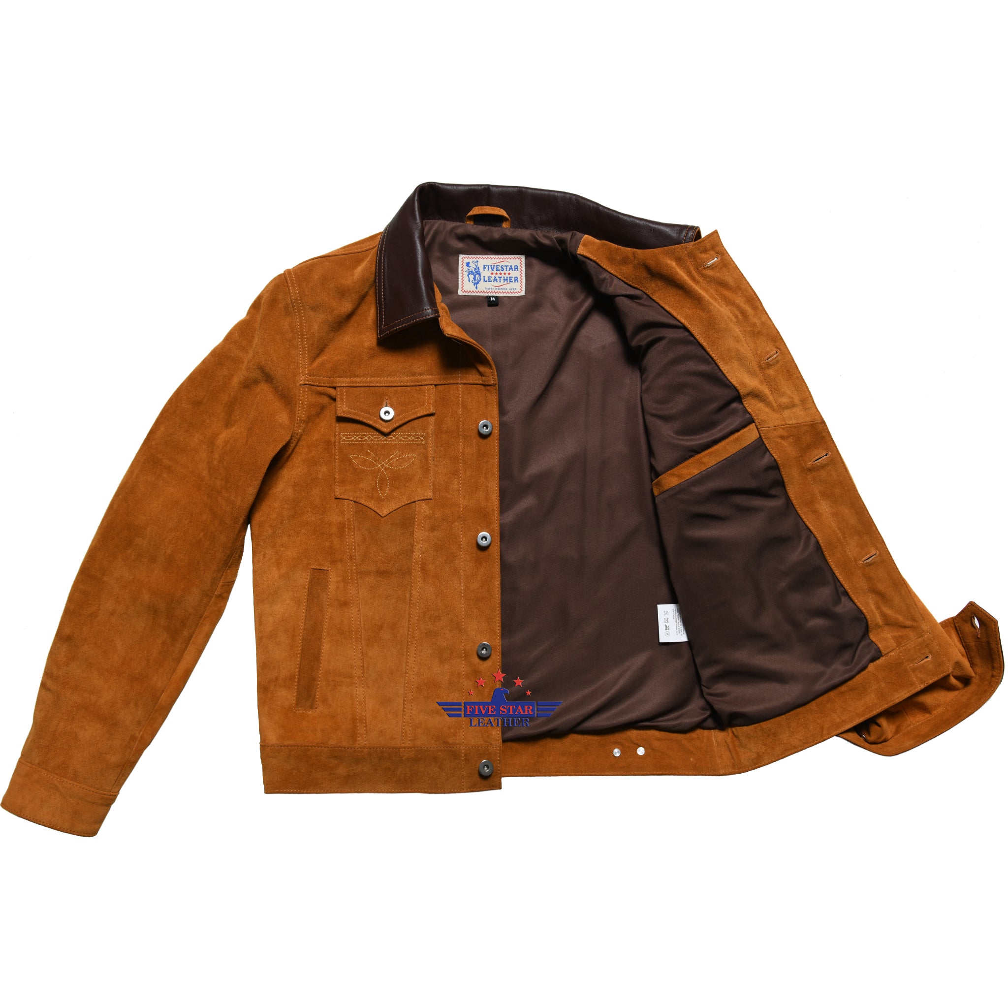 Men Trucker Tan Suede Classic Western Denim Leather Jacket Brown Collar