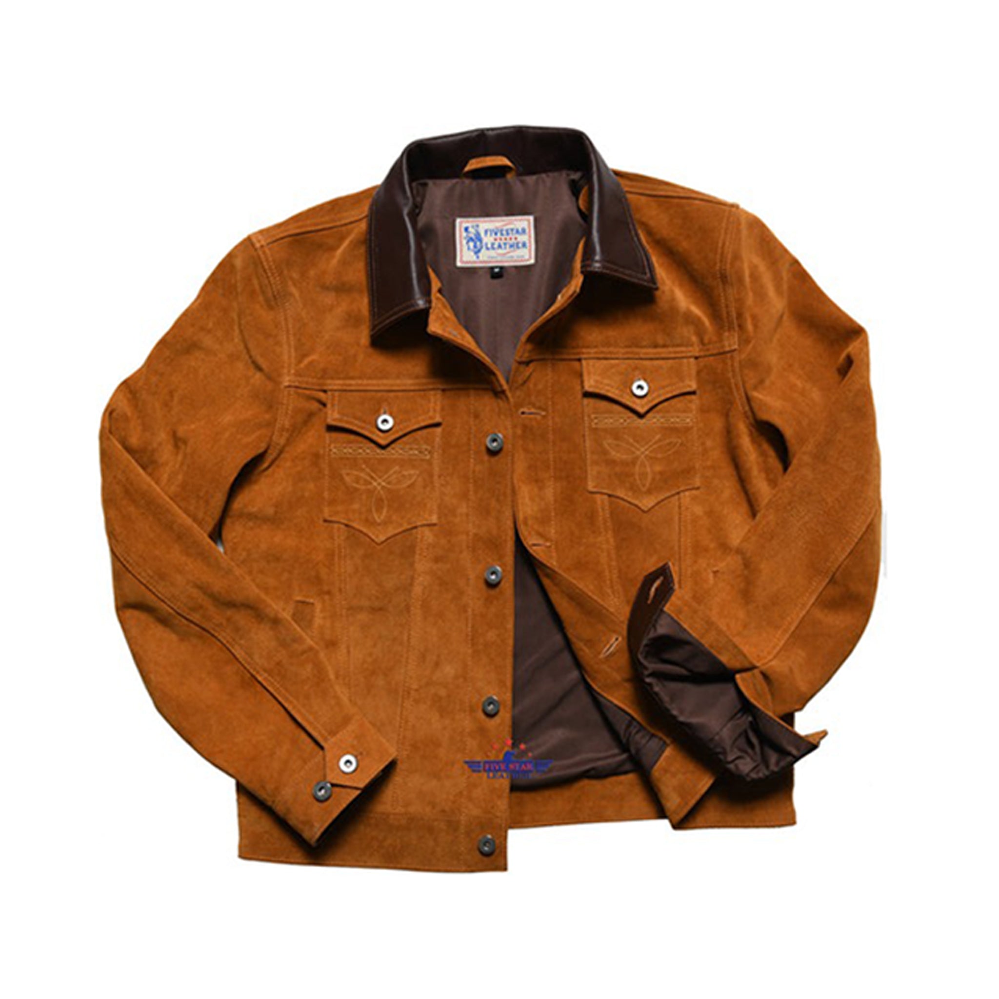 Men Trucker Tan Suede Classic Western Denim Style Leather Jacket with Brown Collar Enjoy the exceptional craftsmanship of this genuine suede leather jacket, highlighted by two embroidered chest pockets with flaps and two practical side pockets. Its beautiful golden brown hue is enhanced by front donut button closures and a seal brown capeskin leather collar. The jacket features a smooth polyester lining and precise stitching, making it a durable and stylish choice you can trust.