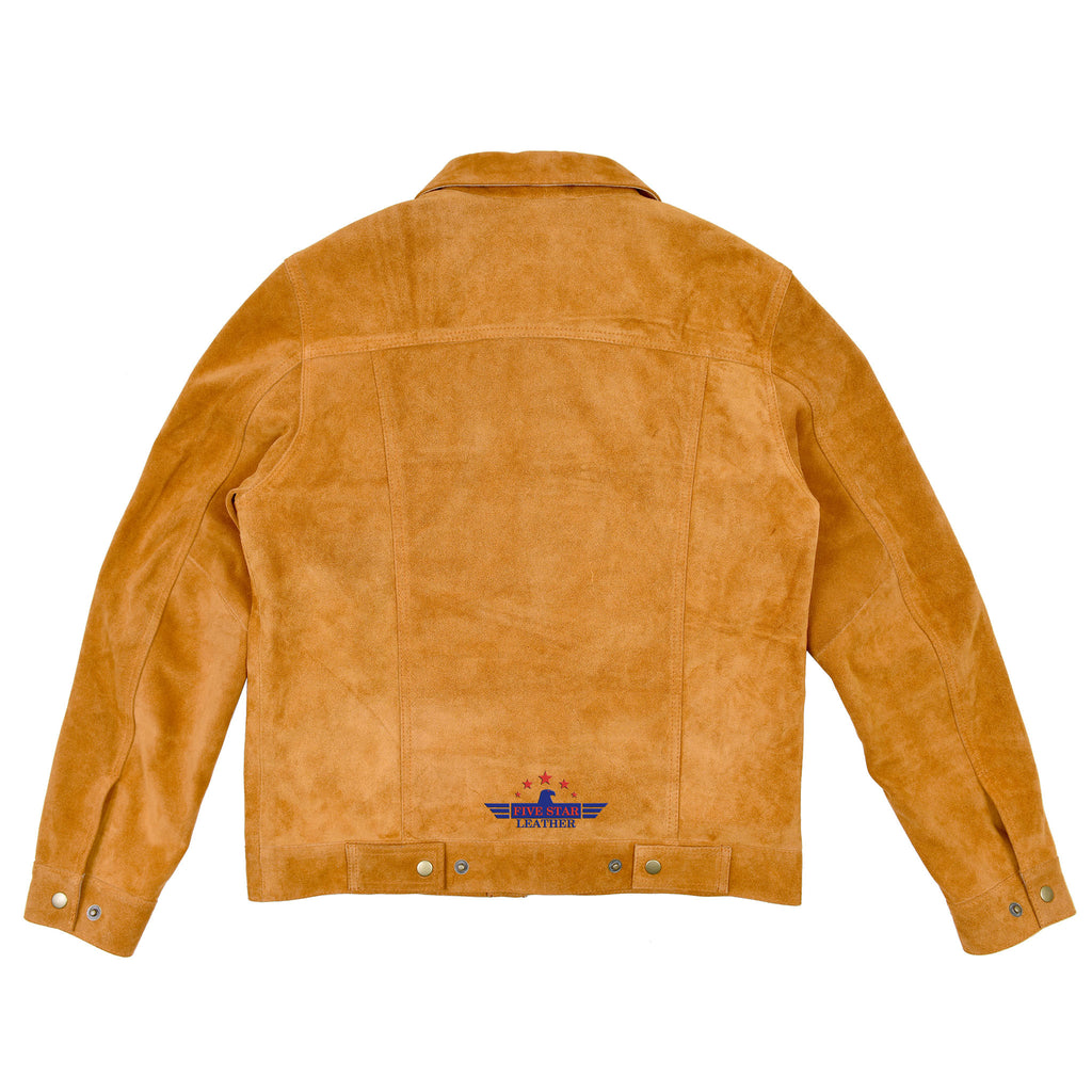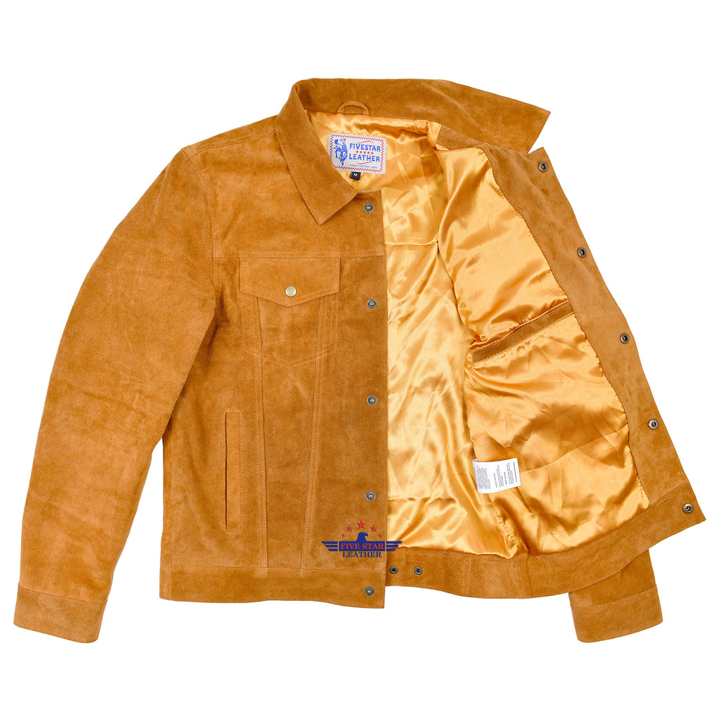 This Men’s Trucker Jacket combines classic retro western denim style with premium quality cowhide suede leather. Crafted from A-grade genuine suede, it features two chest pockets with flaps, two side pockets, and a front press snap closure. The jacket includes one interior lining pocket and is finished with high-quality golden satin lining and precise stitching. Available in golden brown and all sizes, it's designed to offer lasting comfort and style. Explore a variety of other colors and styles also in stock.