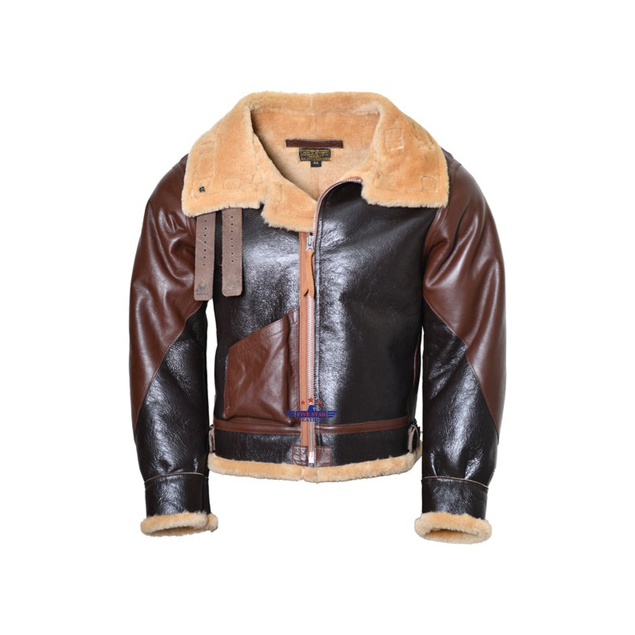 FiveStar Leather Repro USAAF Type B-3 Sheepskin Leather Flight Jacket, Made from thicker and Heavy proper color fleece, Fleece length 10mm Leather color of sheepskin is seal brown true to Original shade, Contrast Heavy Russet Brown Horse Hides Reinforcements, Heavy and Durable Cowhide leather straps, True and authentic look vintage Brass buckles in Nickel finish, Repro Talon Zipper front fastening. Army Air Force Stenciling ,